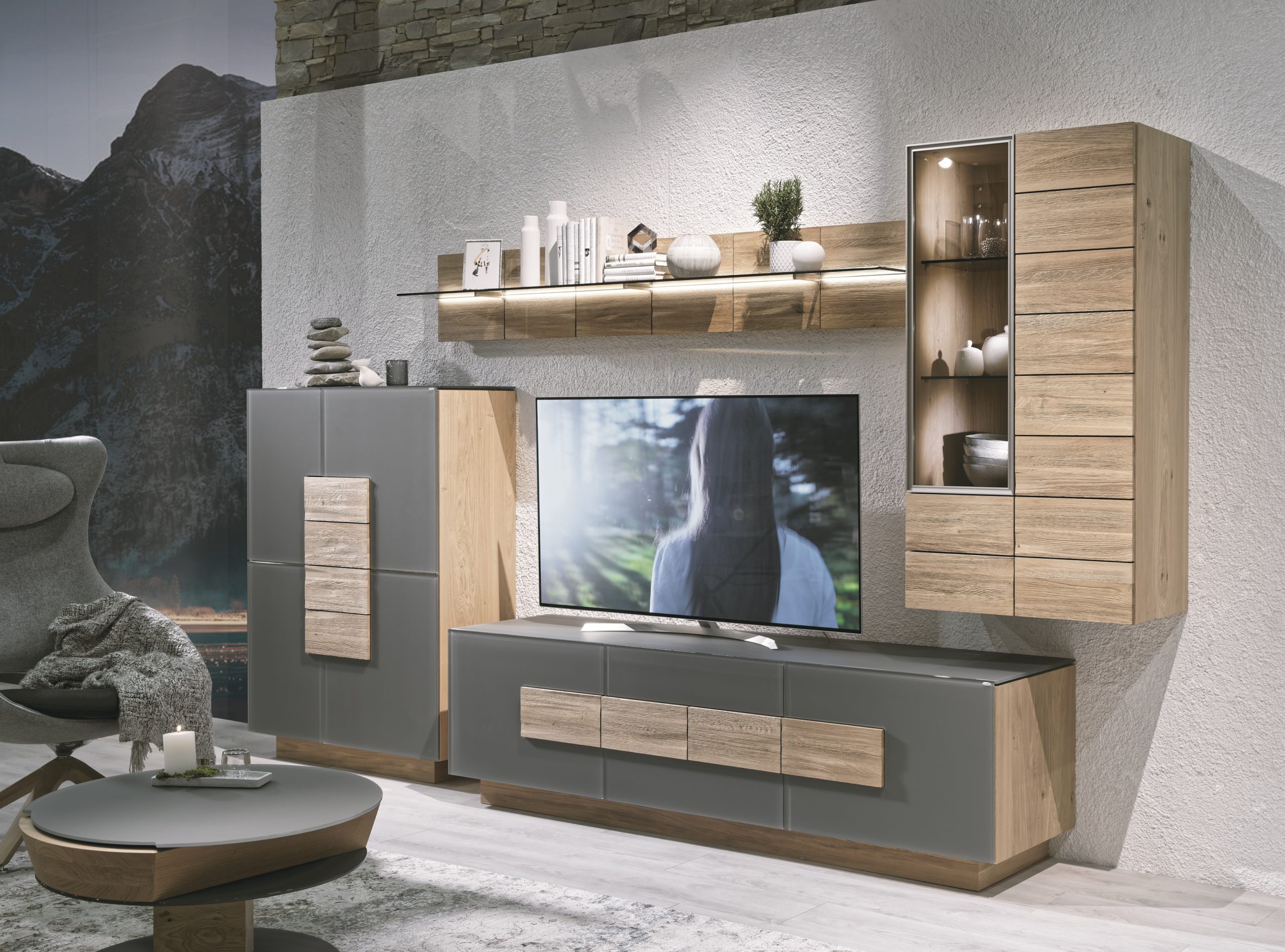 Гостиная VMontanara будет ответом на желание многих людей приобрести нечто натуральное, аутентичное и в то же время современное. Контрастное сочетание рисунка колотой древесины дуба и стекла Satinato.