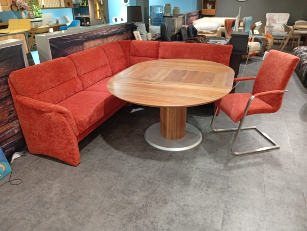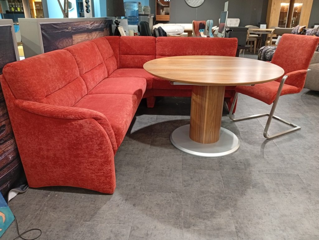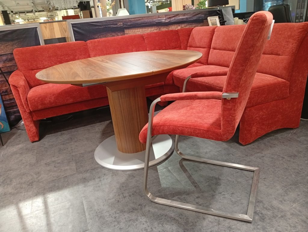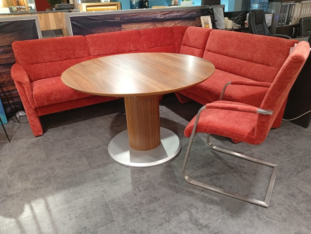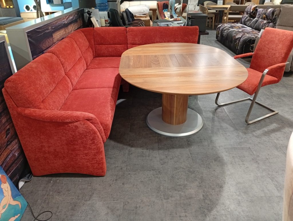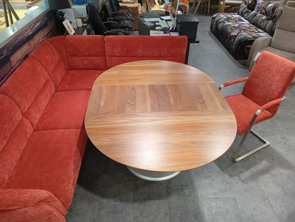 DINNER от HIMOLLA: угловой диван и кресло в ткани, круглый/овальный стол массив и шпон ореха. Диван с выдвижным сиденьем для увеличения глубины; две спинки с изменением угла наклона; в сиденье есть отделение для хранения. Диаметр столешницы 120см + дополнительная вставка 45см. Габаритные размеры дивана: 234х184см.