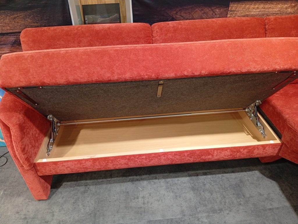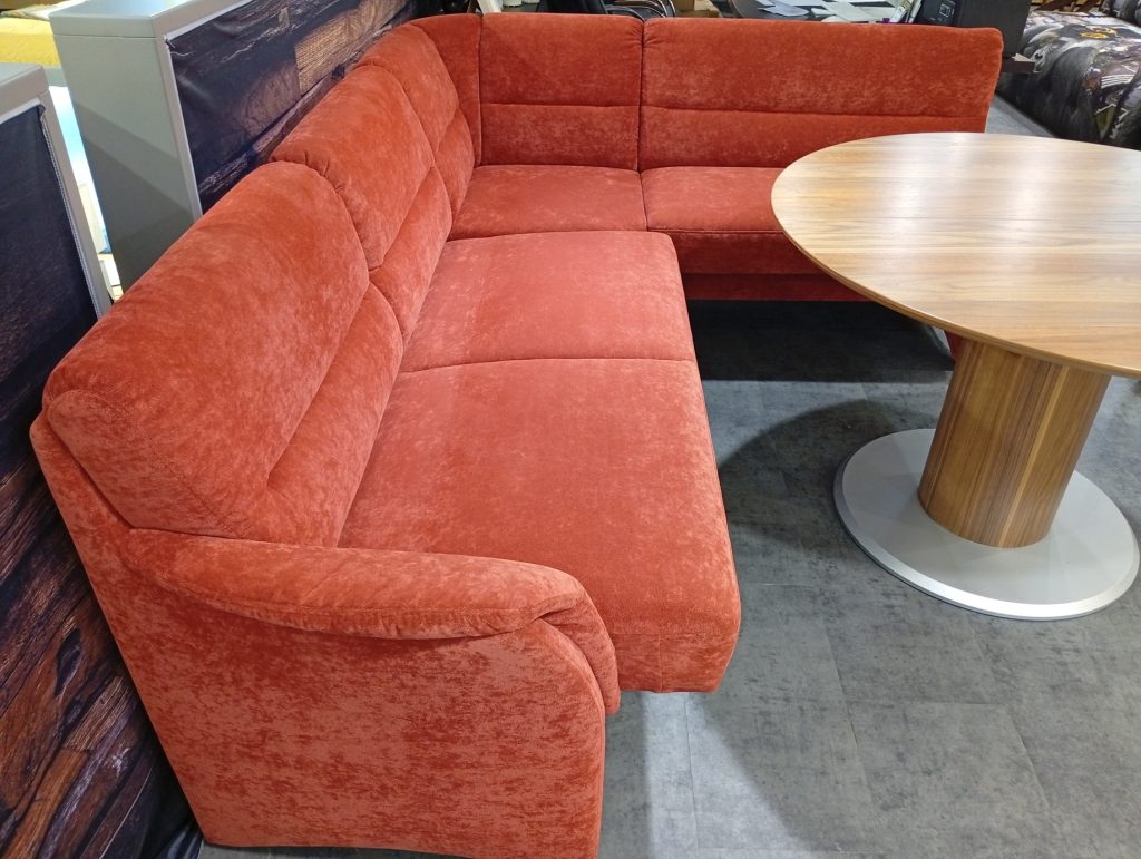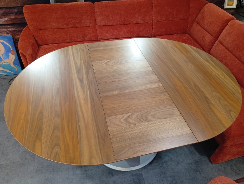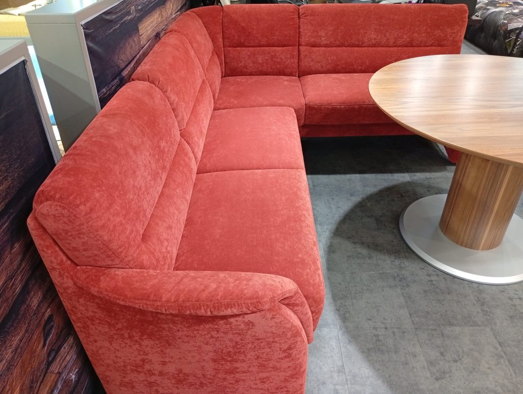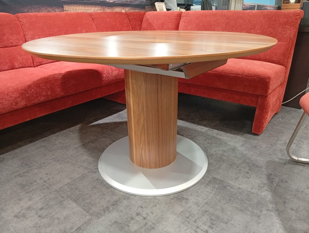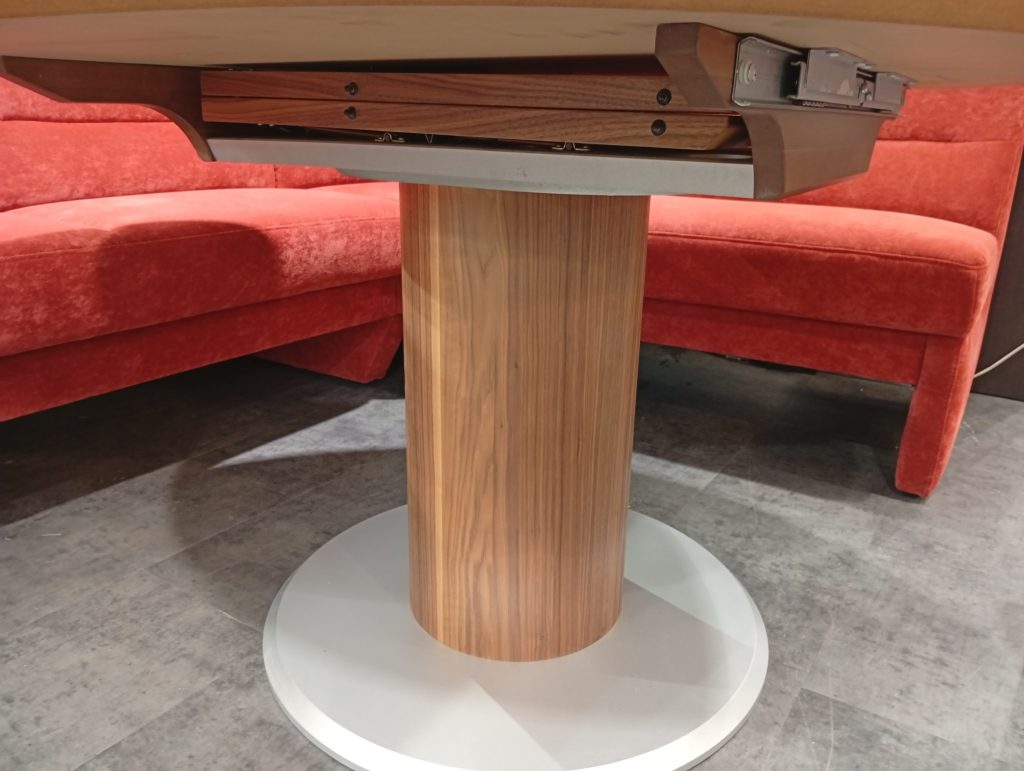 DINNER от HIMOLLA: угловой диван и кресло в ткани, круглый/овальный стол массив и шпон ореха. Диван с выдвижным сиденьем для увеличения глубины; две спинки с изменением угла наклона; в сиденье есть отделение для хранения. Диаметр столешницы 120см + дополнительная вставка 45см. Габаритные размеры дивана: 234х184см.