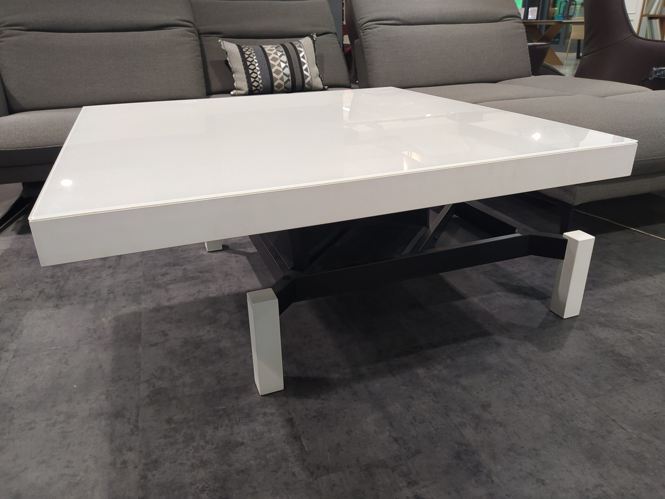 Белый квадратный журнальный столик-трансформер. Столешница из закаленного стекла. Два варианта положения столешницы по высоте. Есть отделение для хранения.
