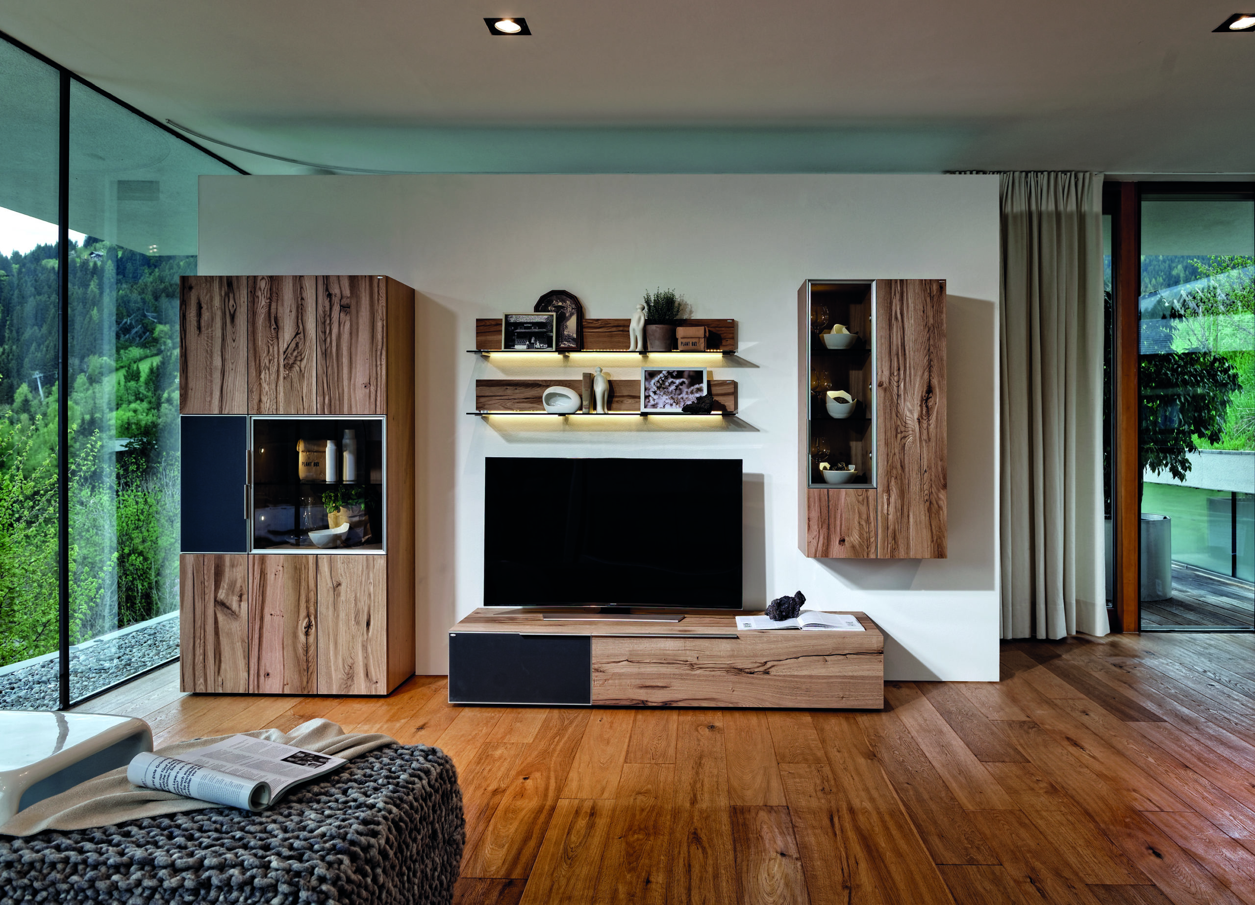 Гостиная VAlpin подкупает своей современностью и самобытностью. Она навевает воспоминания о старом амбаре и придает окружению атмосферу горного жилища: здесь присутствует яркий контраст между сдержанным языком форм и особым материалом. Каждая текстура индивидуальна, при этом спелая древесина дуба раскрывает свою историю. По желанию ее можно комбинировать с мериносовой шерстью или черным стеклом. Таким образом, Voglauer предлагает современное поколение мебели, подчеркивающее природную архаику и самобытность – с радостью от оригинала.