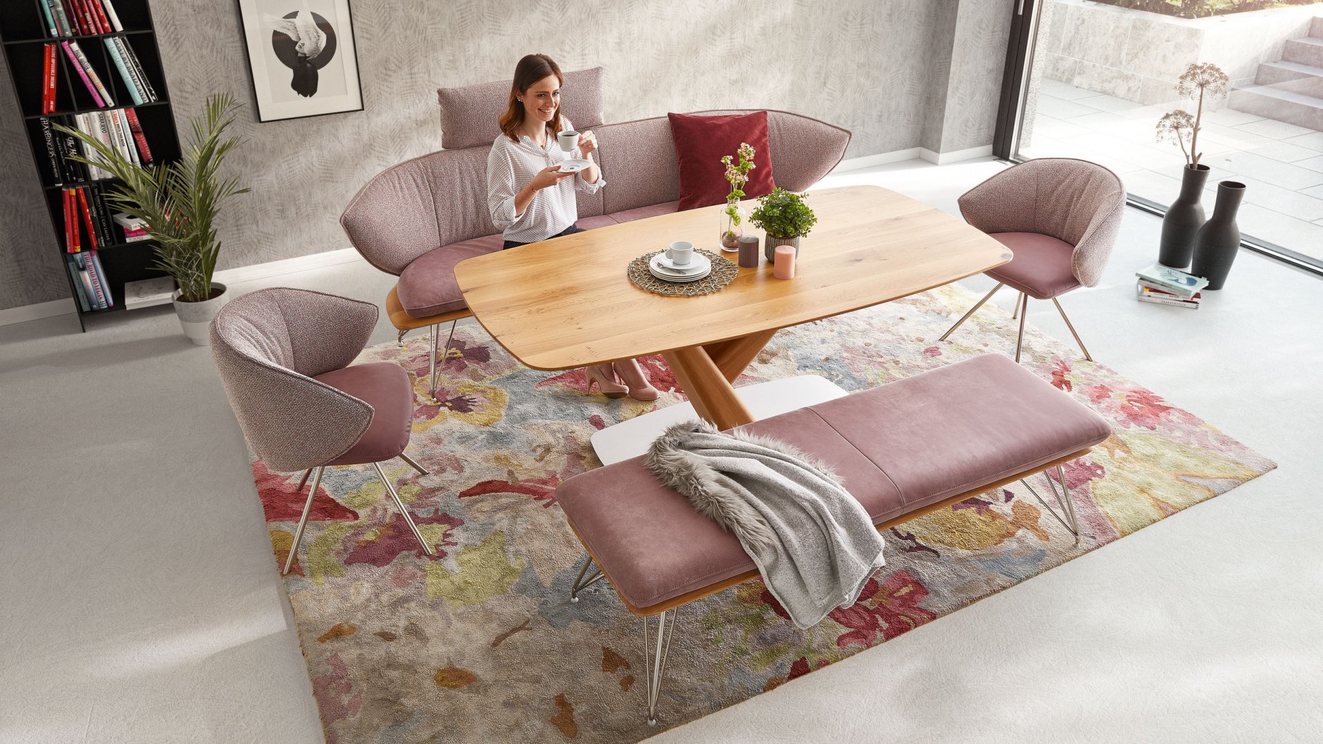В дизайне модели Rosey преобладают тонко изогнутые формы, а с основанием в виде треноги диван выглядит уверенно и в то же время женственно. Дополнительный поворотный подголовник означает, что вы можете откинуться назад и расслабиться в любое время. Rosey очаровывает своим харизматичным и мягким внешним видом в элегантном сочетании непринужденного удовольствия от сидения и игривого дизайна.